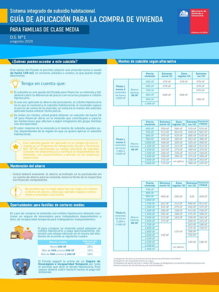 El subsidio habitacional clase media ds1 es un beneficio que permite construir o adquirir una vivienda nueva o usada con valores que van desde los 1100 uf hasta 2200 uf.en caso de las zona norte o extremo sur del país, el valor aumenta a 2.600 uf. Tutorial postulación subsidio ds1 2021.1er. Para conocer si eres uno de los nuevos beneficiarios, debes acceder al sitio oficial web del minvu www.minvu.cl, dirigirte al banner principal que dice revisa los resultados, ingresar tu rut y el número de. Podrán acceder a viviendas de estos proyectos, siempre y cuando cumplan con los requisitos de postulación al subsidio para sectores medios, ds1. Montos de subsidio según alternativa